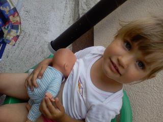 predvčerom som sa nej skoro pocikala. ráno sa hrala v izbe a keď som išla okolo tak vidím ,že si ťahá hore tričko a v ruke niečo držala . tak som sa prizrela lepšie a ona si prikladala malú bábiku k prsníku, vtedy ma zbadala a hovorí mi ,že "bábika je hladná tak ju kojím " 😀 😀 😀 😀 😀 😀 😀
