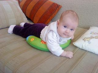 Do sedu sa taha aj ona, ak ju dviham, zacina sa stavat "na zadne", v tomto ju ale troska este brzdim, predsa len je to skoro, aj na chrbticku, este nie je tak pevna. Nepomaham jej, ak chce, tak sa dvihne, ale ziadna pomoc.