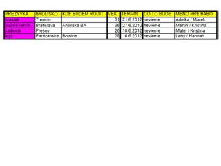 @katus193 ja to len zbieram, lebo ak sa tu rozbehne debata a pribudnu dalsie strany, tak sa bude tazko hladat spätne, ktora tu uz napisala info o sebe. ja moc tabulky robit neviem, ani ju robit nechcem, len zbieram tie infosky a zajtra ju mozete spravit lepsie.. aj tak mi to uklada nejake moc malicke.. ja som z toho talian 😀