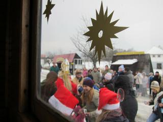 Najprv nas na Agre nalozil nitriansky expres, odviezol nas k zeleznicke, tam nam dal Mikulas sladku maskrtku, aj anjelikovia tam boli, nasadli sme do vlaciku co nas povozil klasicky po kolajniciach cez cele Agro, 🙂