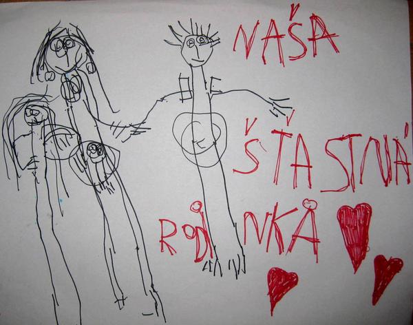 inak my sme tu mali s Viki taky mensi cirkus humberto akurat 🙂 a v tom zrazu dosla za mnou Teri a vravi, ze maminka, mne je to luto, ze ona tak vystraja... nebolo by lepsie, keby isla naspat do bruska ? a ze nieco som ti nakreslila... a toto mi capla do ruky 🙂 srandaaaaa ako to decka vsetko strasne vnimaju.... 🙂 vpravo ocinko, vlavo Teri , v strede ja a Viki spat v mojom bruchu 🙂