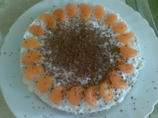 100 ml biely jogurt, 100 ml sladkej smotany, 3 PL kryš. cukru, 1 van. cukor, 150 g tvarohu vymiešať šľahačom na hladký krém. 1 želatínový stužovač do jogurtových dezertov pripraviť podľa návodu na obale a pridať ku krému. Naliať na korpus nechať stuhnúť 4 hod v chladničke. Ozdobiť mandarinkou a horkou čokoládou.