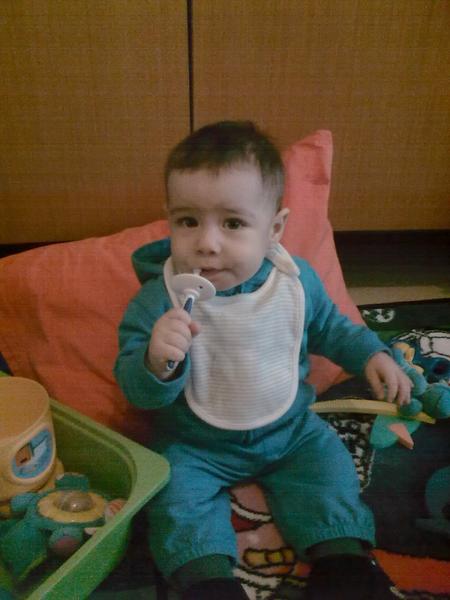 Ked pisete o tom cisteni zubov.....akurat som dnes bola v lekarni a kupila som Riskovi prvu zubnu kefku....mali taku sadu Baby nova-kefku na zuby,take akoby hryzatko(co ma v ruke na fotke) a este jednu kefku ale ma take gumene pichliace a nie stetinky.Zuby sice nema ale ked zacneme tym masirovat a cistit dasienka tak sa mozno aj zubky ukazu.