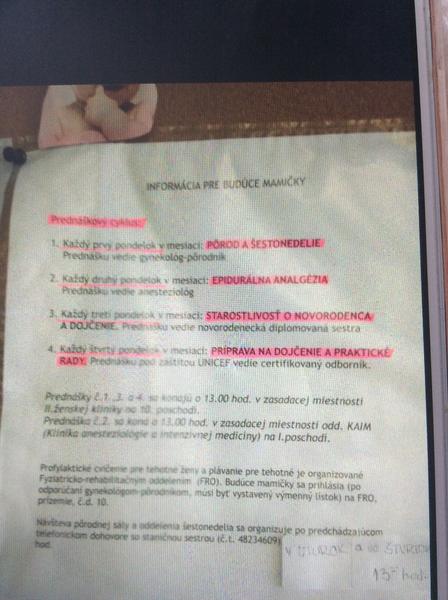 @majkap77každý pondelok o 13je niečo iné len neviem ako to bude toho 1 a 8 ja idem teraz v pondelok to by malo byt ,, príprava na dojčenie a praktické rady " na tu o epidurálke určite choď lebo bolo povedané,že ak nebudeš mať ten papier z prednášky tak ti epidural nedajú je to zdarma a trvá to asi pol hodinu.Toto som odfotila priamo v nemocnici nie je úplne vidno ale tak niečo vyčítaš 😃