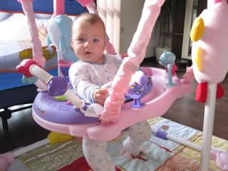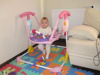 Inak ani my ešte nesedíme. Iba ked ju ja dám do sedu a trošku pridržiavam do strán. Ale zato sa prevracia z brucha na chrbát a opačne ako divá. Dáva sa na kolienka, skôr ide dozadu ako dopredu, ale nepochopila ešte, že aj rúčkami musí napredovať, nie iba kolienkami. Ked ju pridržiavam aby stála, začne skákať o 106. Preto sme kúpili aj hopsadlo zárubňové. Ja viem, že ortopédi to moc nemusia. ja si však myslím, že ked ju tam nechám 20 min za deň trošku sa vyblázniť, nič sa nestane. A ked je prichytím nôžky trošku vyššie, má z toho húpačku a to sa jej tiež veľmi páči.