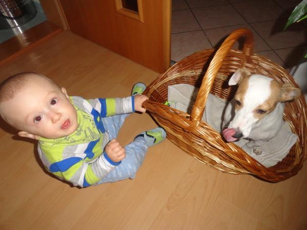 Inak je prdlina moja zlatá keď má čípok a teplota klesne, smeje sa , hrá, papá. Krásne už reaguje, keď prídeme do obývačky ukazuje na TV a vraví "wuáva, wuáva"-preklad "lá-la" akože mám pustiť spievankovo 😀, ťapne mi po ruke keď mu poviem, robí brm brm pusinkou-prštekom, najskôr to robil celou rukou, ale už vie aj ukazováčikom, smeje sa keď mu začnem variť kašičku, lebo vie, že ho pošteklím na konci-je hrozne šteklivý 😀, robíme baran-buc, naučil sa dávať pusinky, ale mne dal len asi 2x, no baby pusinkuje, ke mu poviem pod búvať, tak si demonštratívne dá hlavičku na vankúš čo má v obyvačke na deke, keď mu je smutno, alebo sa udrie, mrnčí a štvornožkuje zamnou a mrmle si "mama-mama", reaguje na pomenovanie predmetov napr. opýtame sa kde je lampa, alebo havo, tak sa na to pozrie. Stále ho neprešiel záujem o psa, tá naša Zora má s ním našťastie trpezlivosť 😀 Zajtra bude mať 9 mesiacov už to začína byť zábava 🙂