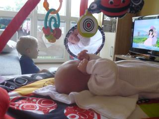Síce nemá nejaké super otcovské sklony (nevie sa hrať s deťmi a už vôbec nie s babami, on len o chlapcovi sníval... ale to je tak , keď on pred tým ako sme mali naše vlastné, deti videl asi len na obrázku, tak sa nečudujem), ale čo poviem urobí, ale MUSÍM to povedať (to ma tiež niekedy príšerne rozčuľuje). Nejaká samostatná aktivita nehrozí...