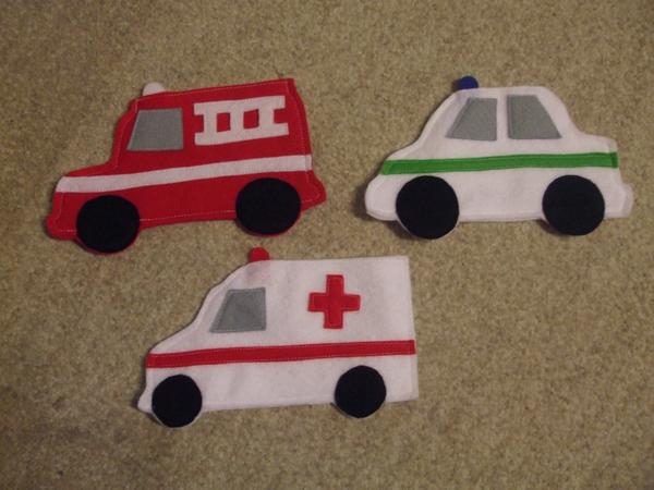 2. Čo potrebujú záchranári- ušijem sanitku, policajné auto a hasičské auto z filcu, ale tak, že hore nezošijem a bude to ako vrecko, do toho sa budú priraďovať kartičky, na ktorých budú obrázky s tým, čo potrebujú k svojej práci...napr...hasiči- hadicu, prilbu, ... atď. (ilustračné foto z netu)