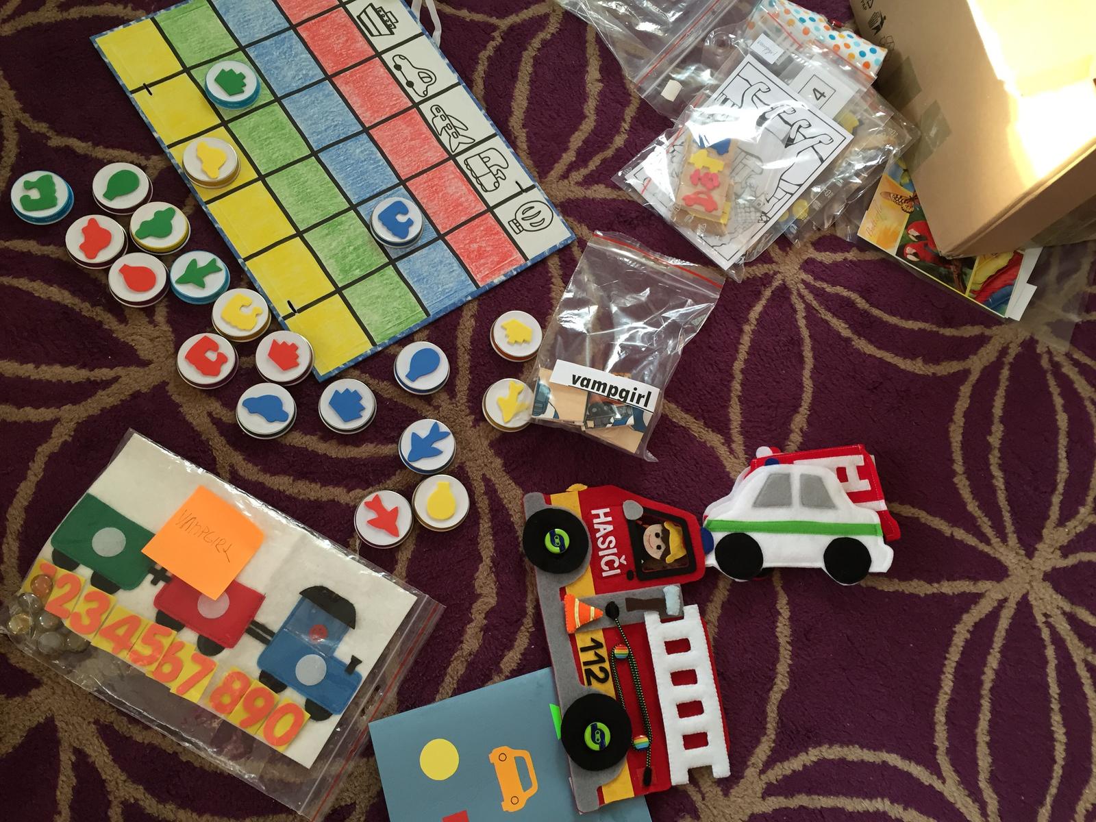Aj my sme sa už dnes večer zarali 🙂 Foto zatiaľ nemám. Zatiaľ najviac vedie hasičské auto.... ale neotvorili sme všetky balíčky. Všetkým vám chcem veľmi poďakovať za to, ako krásne a dôsledne ste svoje aktivity vyrobili. Sú fakt úžasné. Toto je moja len 4 výmena a je úplne top. V priebehu som aj ľutovala, že načo som sa hlásila, keď nemám toľko času, ale dnešný balíček ma presvedčil, a neľutujem ani minútu, ktorú som koli výrobe ponocovala 😀 keď videl aktivity manžel, tak skonštatoval, že ale toto bola nejaká "iná výmena" - v zmysle toho, že aké krásne hračky nám prišli.