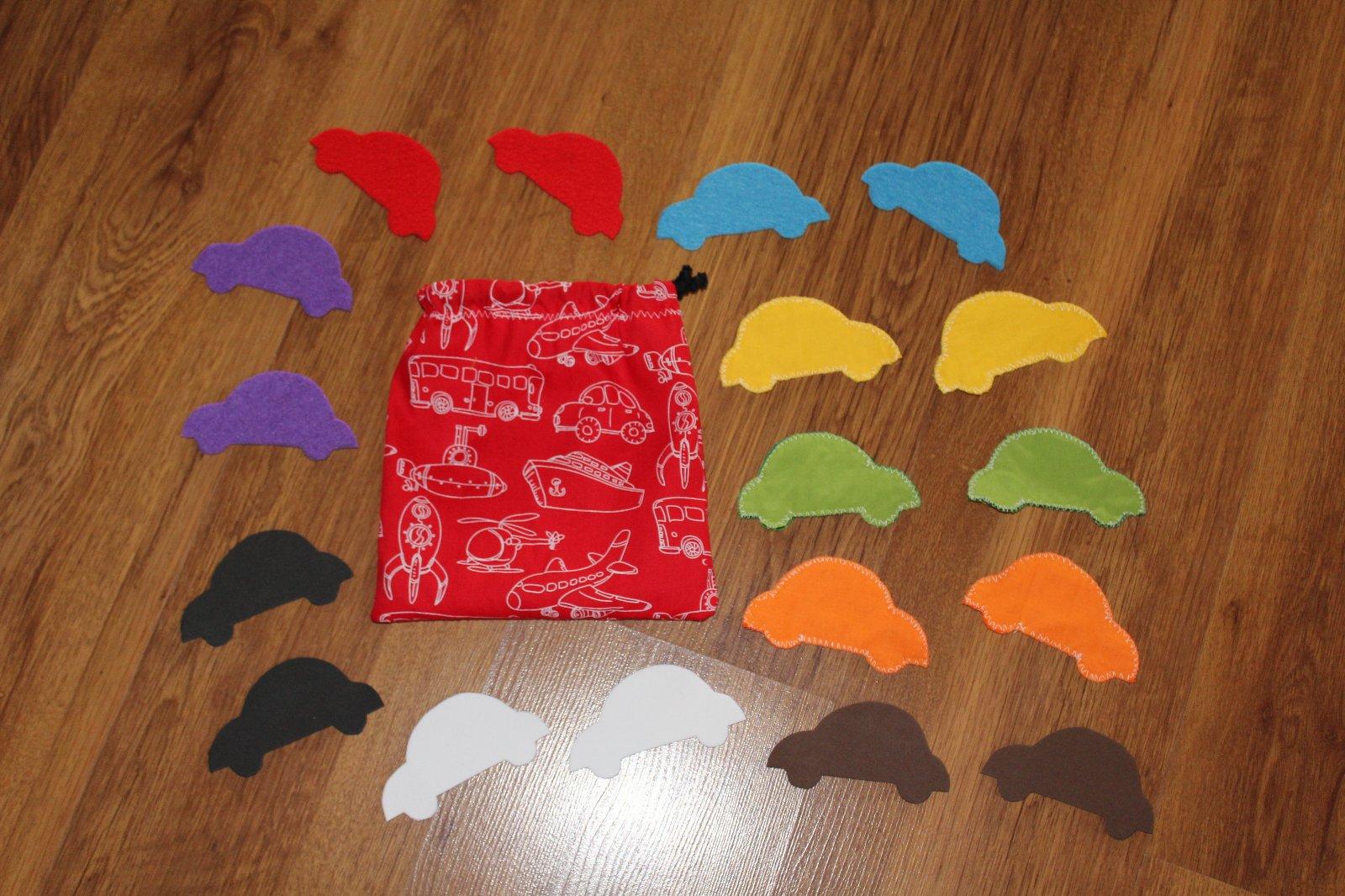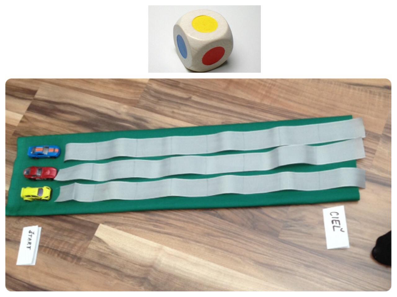 1. Preteky áut - hádže sa farebnou kockou a podľa toho, aká farba padne, tak sa pohne autíčko o jeden diel na svojej dráhe. Hracia podložka by ušitá, kocka by bola drevená, autíčka by ste si museli doplniť z vlastných zdrojov. Počet autíčok a farby by sme upresnili - myslím, že pre malkáčov stačia aj dve autá. Foto je ilustračné, určite by to vyzeralo oveľa lepšie.