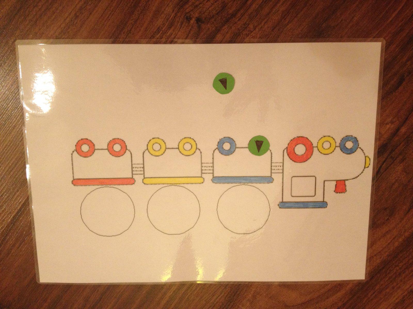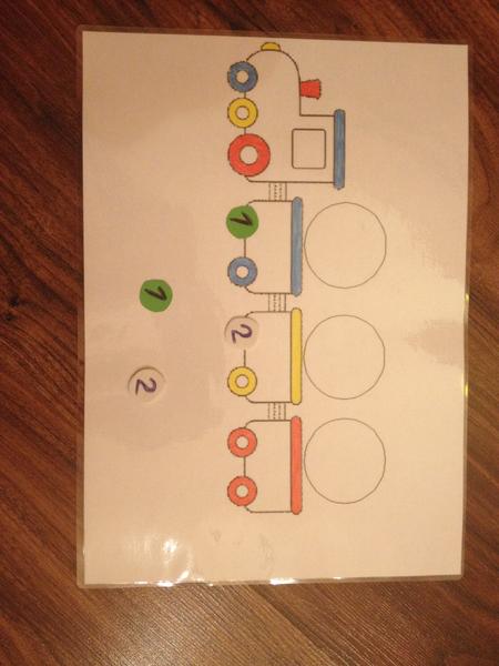 1. Vlacik – prikladanie cisel od 1 do 10.. na jednotlivych vagonikoch by bolo na pevno jedno koliesko a druhe by dieta malo najst a doplnit.. Odfotena je nasa zalaminovana predloha, na ktoru moj drobec uklada magnety, zatial podla farby.. postupne by som chcela aj tie kruzky nad vagonikmi vyuzivat – na tvorenie jednoduchych slov.. 🙂