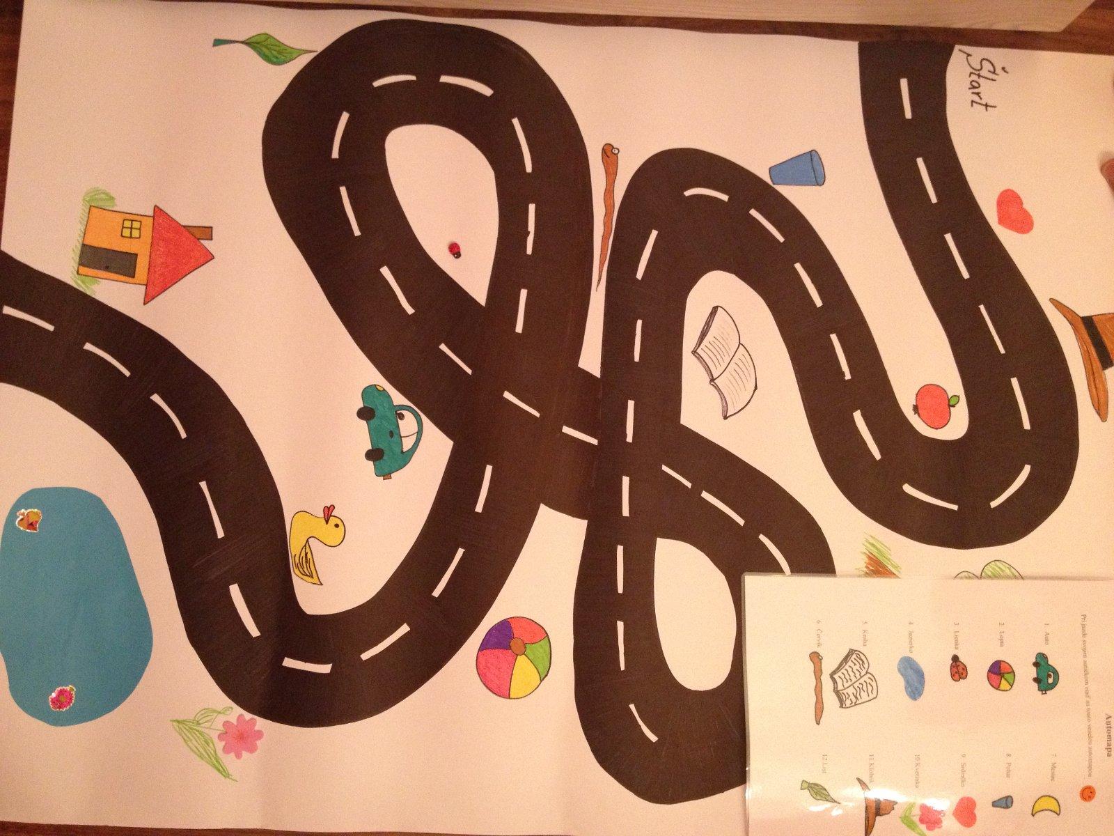 Aktivita zamerana na koordinaciu ruka/oko. Princip aktivity: na samostatnom liste budu nakreslene rovnake obrazky, ako su pri cesticke = mapa. Ulohou dietata bude postupovat podla takto pripravenej mapy. Sucastou bude aj dalsi zoznam, ako je na obrazku so slovickami – vyuzijete neskor na precvicovanie citania.