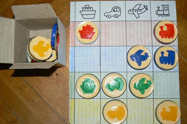 4. Prikladanie vrchnacikov – pouzity material viecka od detskej vyzivy, dopravne prostriedky z machovej gumy a podklad karton, velkost vychadza cca 30x30 cm