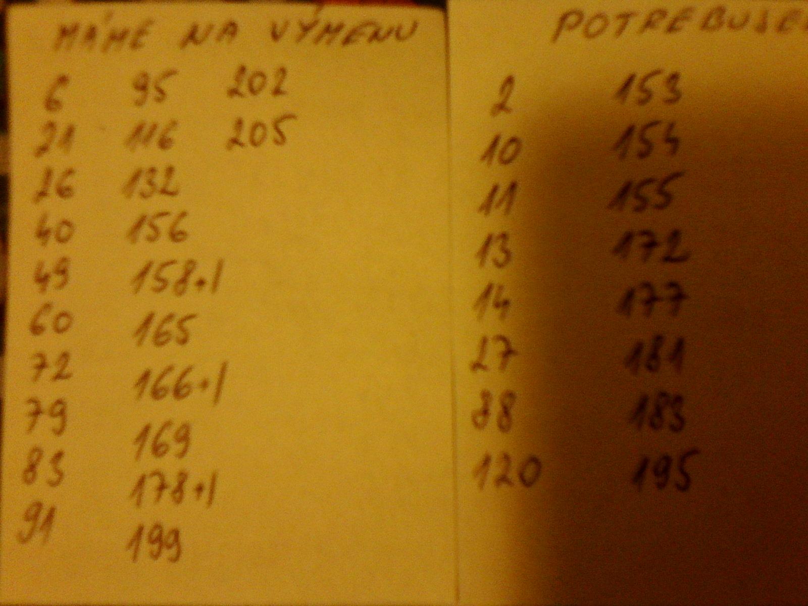 mam na vymenu: 4, 16, 30, 31, 41, 48, 49, 68, 75(2x), 98, 100(2x), 110, 123, 124, 127, 129, 138, 145, 157, 170, 190
