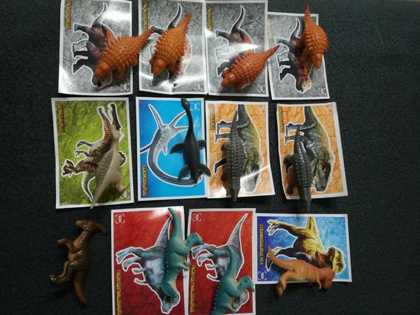 Ahojte, do zbierky nám chýbajú: velociraptor, brachiosaurus a parasaurolophus. Na výmenu máme: pteranodona, spinosaura, triceratopsa, stegosaura, ankylosaura, saurosochusa a pachycelaphosaura. Iba v Ba.