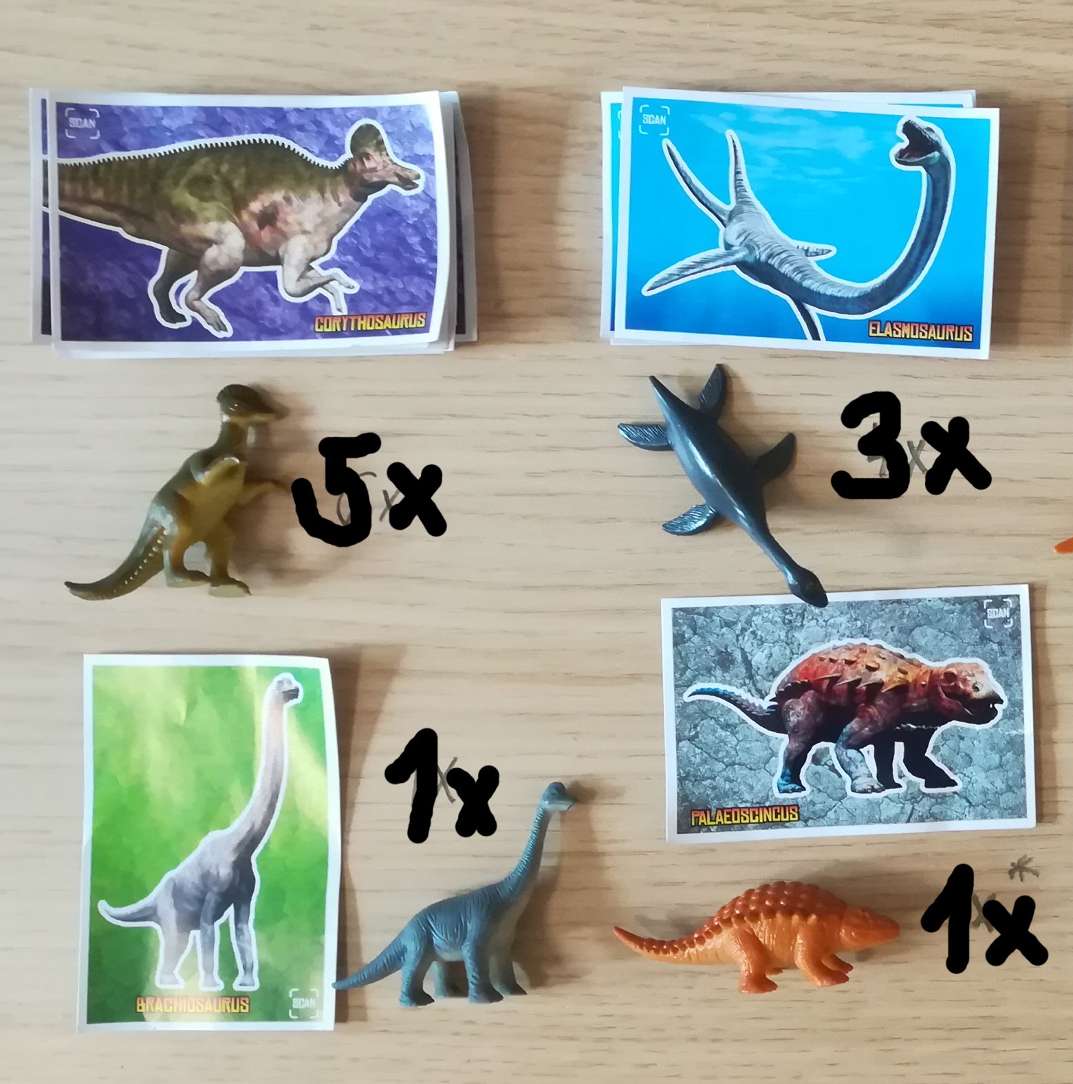 Na vymenu mam (su na foto): 3x Stegosaurus, 3x Pteranodon, 2x Brachiosaurus, 1x Corythosaurus.