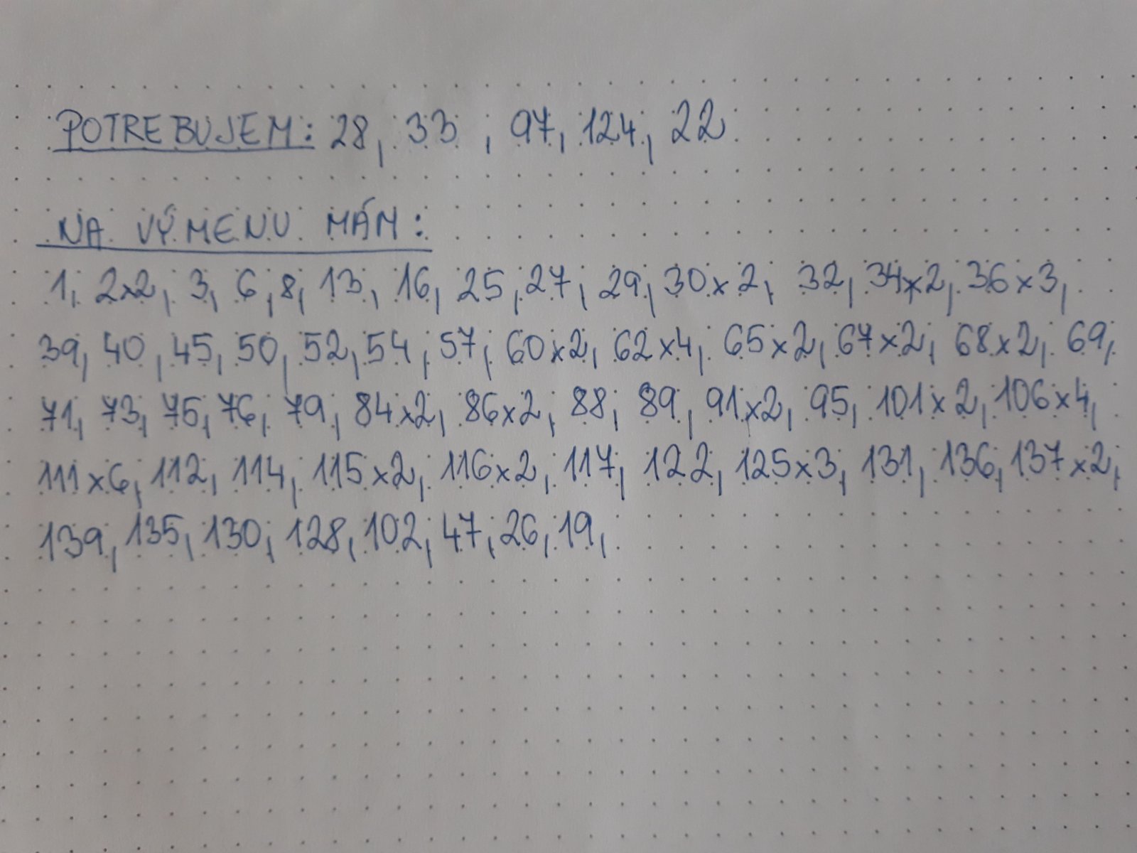 Potrebujeme: 1, 3, 7, 10, 12, 14, 17, 20, 23, 27, 40, 42, 54, 57, 58, 60, 62, 64, 65, 67, 70, 72, 74, 83, 86, 87, 89, 90, 97, 101, 109, 112, 113, 115, 119, 121, 122, 124, 127, 134.