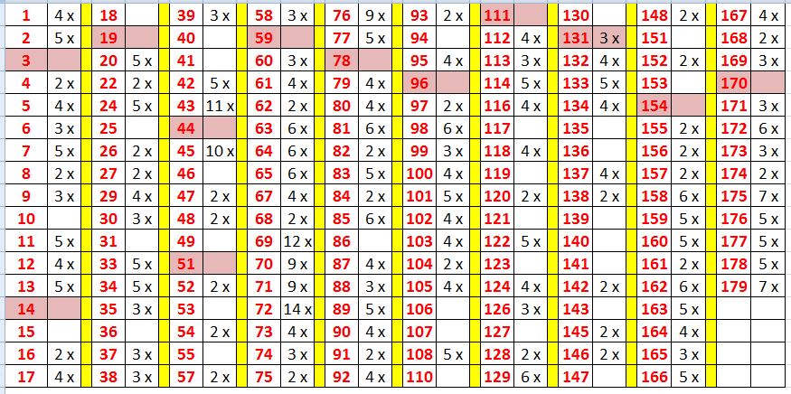 4x4, 5, 3x8, 9, 3x12, 15, 2x17, 22, 26, 28, 2x42, 7x45, 3x47, 2x49, 2x52, 53, 54, 3x55, 57, 58, 60, 3x62, 63, 2x64, 3x67, 68, 3x69, 2x70, 3x70, 4x72, 2x73, 3x75, 76, 81, 6x84, 85, 7x88, 89, 91, 92, 95, 97, 98, 99, 100, 104, 106, 112, 114, 116, 120, 121, 124, 131, 2x137, 2x141, 2x143, 2x146, 148, 2x151, 2x152, 2x153, 155, 2x157, 158, 159, 2x161, 162, 2x163, 3x165, 2x,166, 167, 2x169, 2x171, 3x172, 174, 175, 177
