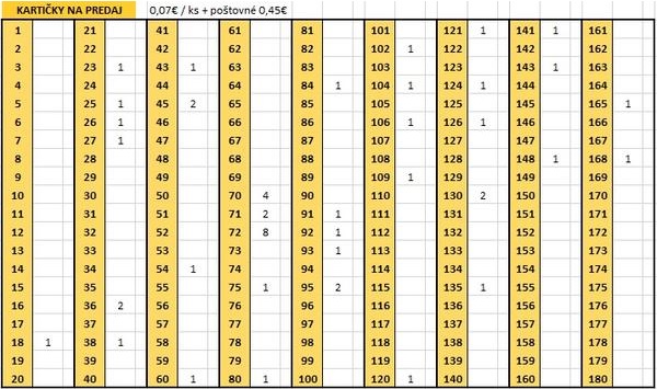 Predám za symbolické 3 centy/kus (plus poštovné) a to pri odbere aspoň 3 kusov kartičiek z nasledujúcich čísel: 10, 29, 42, 43, 68, 70, 70, 71, 71, 71, 71, 80, 171, 171, 171, 174, 178.