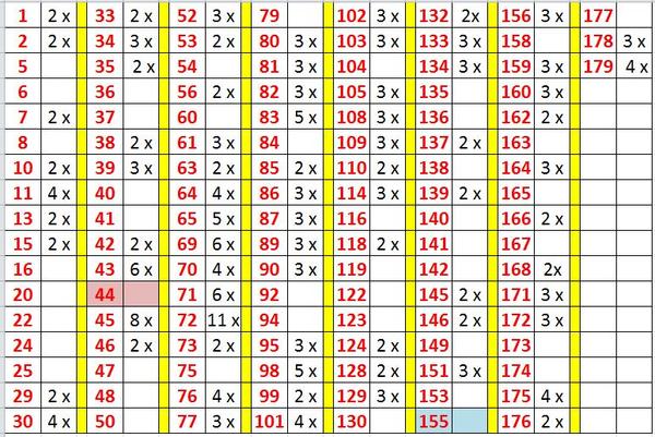 mám: 4,5,8,13,16(2x) ,21,25(2x),26,27,28,29(2x),33,38,43(3x),48,49,50,54,57(2x),62,69(2x),70(2x),72(2x),73,77,79(2x),84,89,92,94, 97,99,100,105,107,110,115(2x),119,123(2x)124(2x),127,137,145,147(2x),148(2x),155,157(2x),159,163,170,172,173,176,177(2x).