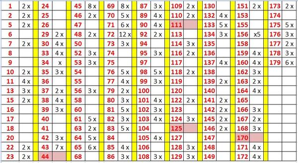 4,7,8,11,12-2x,15-2x,16-2x,20,21,24,30,31,33,37,38,39,43-5x, 45,46,48,52,54-2x,56,57,61-3x,65, 68,70-5x,71-2x, 72,73,74-2x,80,83,84,87-2x,88-3x,89,91-2x, 95,97-2x,103,104-2x,107,108,110-2x,114-2x, 115, 119,122,123,126,130,134,138,142,146,147,148,149,151,152-2x,153,156,160-3x,162,164, 167,168-2x,175-2x,177