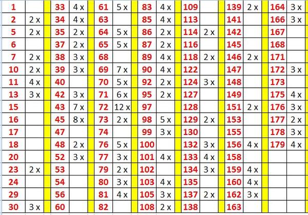 008, 009, 010, 012, 013, 017, 020, 022, 024, 026, 029, 034, 038, 043, 045, 046, 048, 054, 055, 058, 060, 062, 064, 067, 068, 069, 071, 072, 073, 076, 080, 081, 084, 085, 088, 089, 092, 095, 096, 099, 101, 103, 105, 106, 112, 113, 114, 116, 118, 120, 122, 124, 128, 133, 137, 139, 140, 145, 147, 148, 153, 155, 157, 159, 161, 165, 166, 167, 171, 174, 175, 176, 178