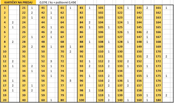 na vymenu alebo predaj mam : 1,5,10,13,15,16,20,21,23,24,25,33,34,37,40,41,42,45,46,47,50,55,60,62,67,68,69,70,71,72,73,75,76,77,79,80,81,82,89,90,91,94,99,101,102,103,104,106,107,109,113,115,118,119,122,123,127,132,133,135,136,137,140,141,145,149,155,157,161,163,165,166,167,169,171,172,173,174,175,176,178,179