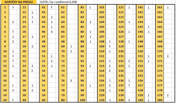 PREDAM za 0,10€/ks: 1,7,8,9,10,11,12,13,17(3x),18(2x),20(2x),22,23(3x),24,26,28(2x),29,30,31,33,36(3x),37,38,39,40(2x),43,45(3x),46,53,57,58,61,64(3x),69(4x),70(2x),71,72(4x),73(2x),75,79,81(2x),83,84,85,88,91(2x),92,94,95,99(2x),102,103(2x),104,105,107(2x),108,112(2x),113,116(4x)117,118,120,121(2x),122,123(2x),124,127,129,130,132,135(2x),137,138,140,141,143,151(2x),160,163,165,167(2x),172,173,175,176,179.
