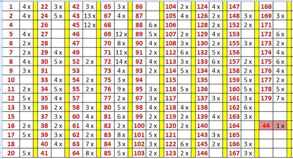 43(2x),45(2x),47,64,68,69(4x),70(4x),71,72(3x),73(2x),79(2x),83(2x),84(3x),87,88,91,92,95,