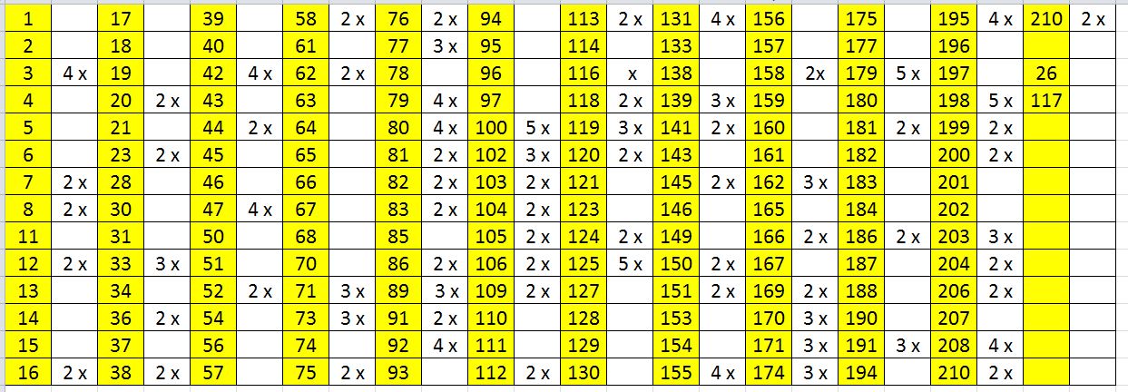 3,4,21,23,31,32x2,36x2,47,52x2,53,65,73,74,77,84,85,88*2,91,93,96,98,107*2,111*2,127,131,136,137,140*2,160*2,161,163,