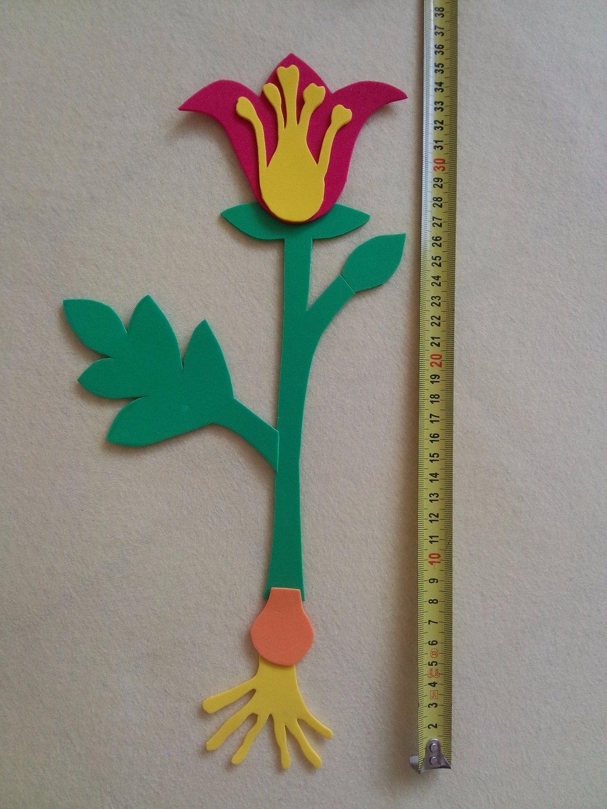 1. SKLADANIE KVETINKY kvietok bude z machovej gumy, velkost cca 35cm Je to moj nedokonceny prototyp, este tam chcem farebnymi perami dokreslit zlozenie piestika a zilky na listi. Cibulka bude hneda a korene biele, len som teraz nemala doma taku farbu.