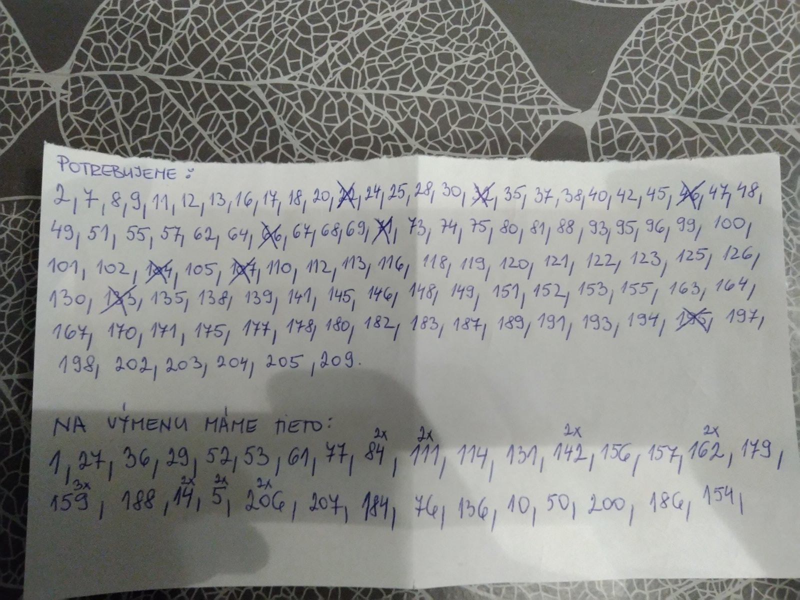 Ahojte, zatial mame navyse 8,25,46x2,52,54,61,81,97,102x2,105,113,114,115,123x2,124,144,149,195,196,199 a 200. Chybaju nam 1,21,23,27,29,36,38,40,48,53,66,71,72,75,82,83,88,89,90,99,100,108,116,119,121,25,127,129,137,148,150,151,169,172,185,187,198,206,208. ma niekto na vymenu?