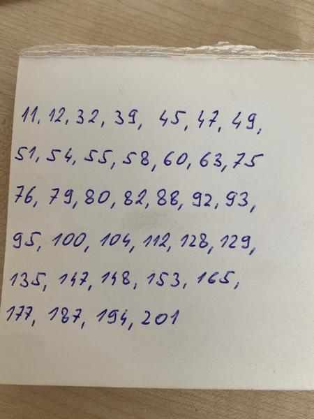 Chyba nam: 5,11,12,14,19,27,29,31,34,40,41,48,50,51,56,70,80,82,85,92,96,98,110,114,116,126,129,132,133,136,141,143,144,145,148,151,156,159,168,169,171,173,178,182,186,192,198,209.