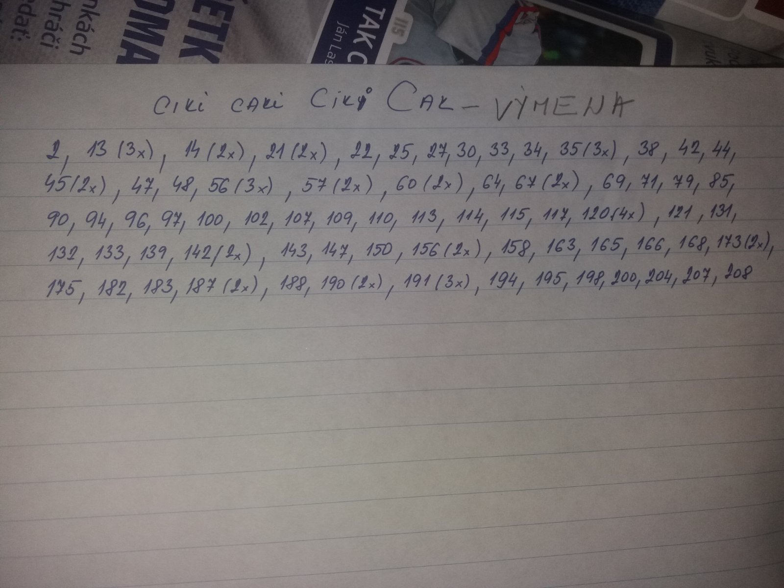 @vall1319 teda ak plati zoznam z dnes o 10:33 tak vam viem dat viac ako som pred chvilou pisala teda: 2, 10, 13, 14, 19, 27, 42, 48, 67, 120, 128, 132, 143, 146, 156, 174, 183, 188, 191, 200, 206, 208