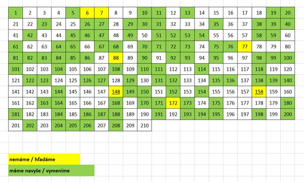 Na výmenu máme 2,4,8-2x, 19,21-2x, 42-2x, 44-2x, 50,51,58-2x, 61,66,71,78-2x, 79-3x, 81,97,101,109,118,124,125,126-2x, 131-2x, 132,134-3x, 138,142,146,148,154,156-2x, 160,166,173,180-2x, 182-2x, 184, 190,192-2x, 196,201,206,210-2x