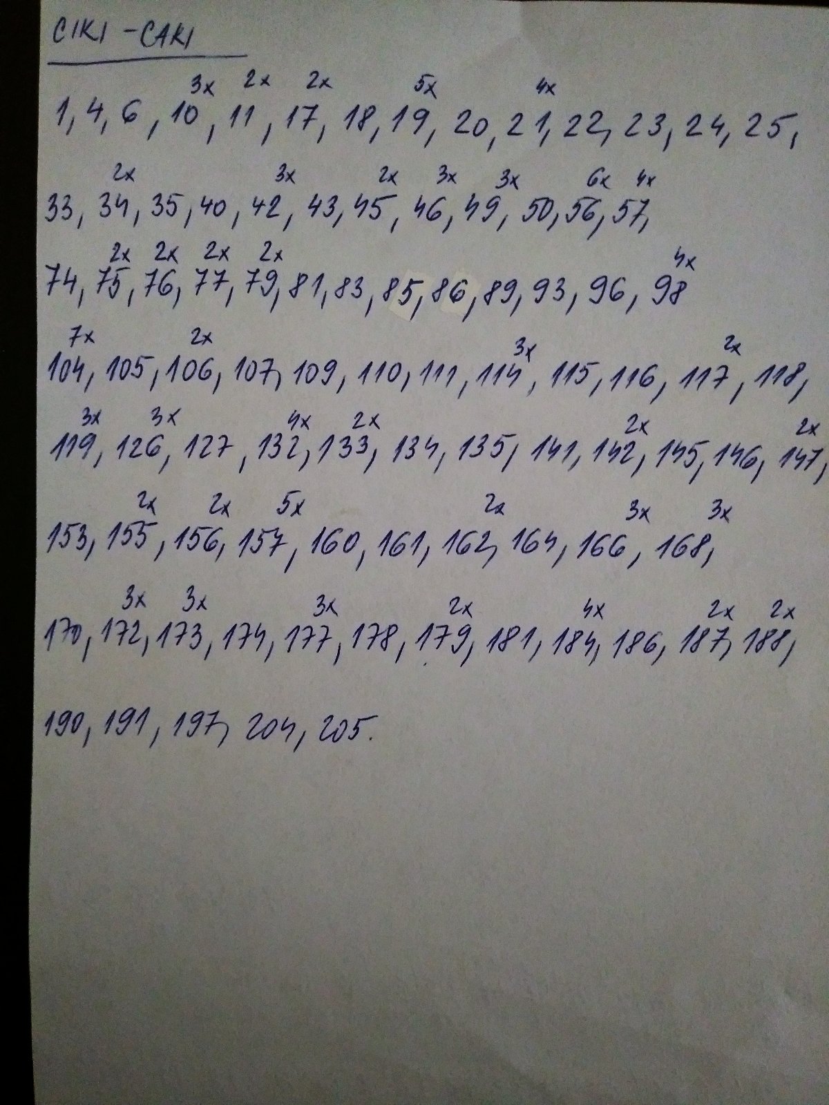 1, 3,10,13,14,22,23,30,37,40,41,48,51,52,53,62,67, 71(3×),74,76,78,83,87,93,94,96,99,100 (2x),107,118,119, 124 (4x), 128,135,141,146 (2x), 147,149,151,154, 157,160,169(2x), 171,177,183,186(2x),189,195,196,199(2×), 200,206,207,210(3×).