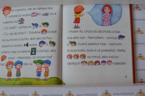 kedysi existovala knizka "O ponikovi, medvedikovi a stratenych jablkach". Krasna knizka, kde slova ako strom, ponik, jablko, vtacik... boli nahradene obrazkami a tak aj dieta, ktore este citat nevie, si moze "citat" s nami. Dospely cita slova a dieta doplna obrazky. Tuto knihu vsak uz nie je mozne zohnat :(
