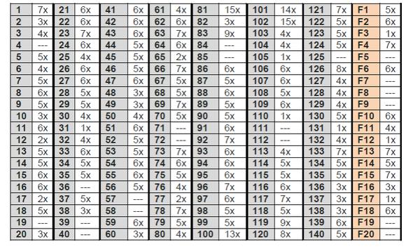 2xF1,9,2x14,20,2x21,23,28,38,44,61,66,73,76,77,80,82,96,101,102,109,115,119,2x122,3x126,137