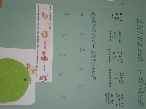zatiaľ sú tu 2 ukážky, či viac? tie sa mi páčia nič by som nemenila, tak dávam s malou dušou aj ja ten môj výtvor, komentujte a pýtajte sa.. zatiaľ je to všetko len tak rukou písané, potom to urobím na počítači, tie obrázky s prstami na prvej fotke a na druhej sú vlastne otváracie (keď otvorí obr. s počtom prstov, tak pod ním je zobrazené číslo), takisto na druhej str. lapb. (foto3) je príklad a po otvorení je to prirátané počtom bodiek a výsledok (zatiaľ som to nelepila), potom je tam delenie na polovice, tretiny, štvrtiny. Neviem, chcete aj násobenie? (ja by som nedávala, ale prispôsobím sa). Na 3str. sú tvary, to tiež dorobím, prilepím obr. s každým tvarom a z neho sa budú dať vyberať a znova vkladať tie tvary, tie postrihám a zalaminujem.