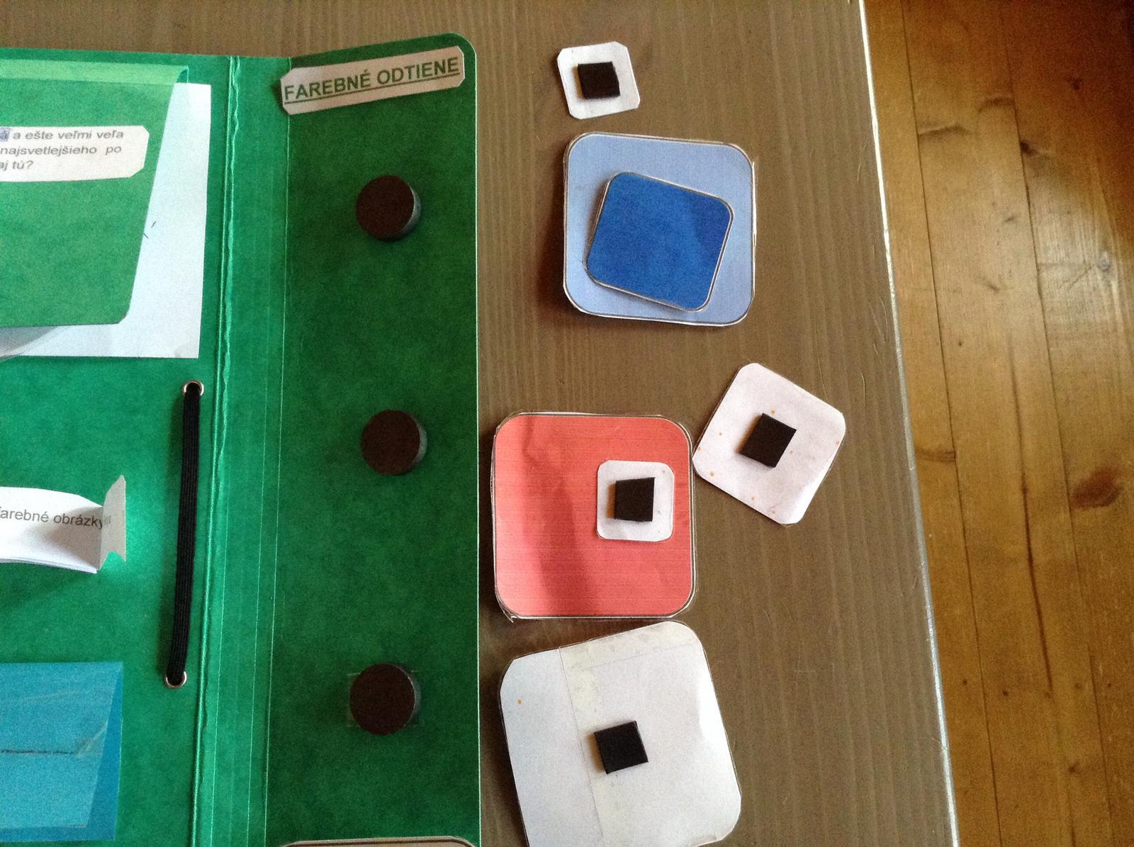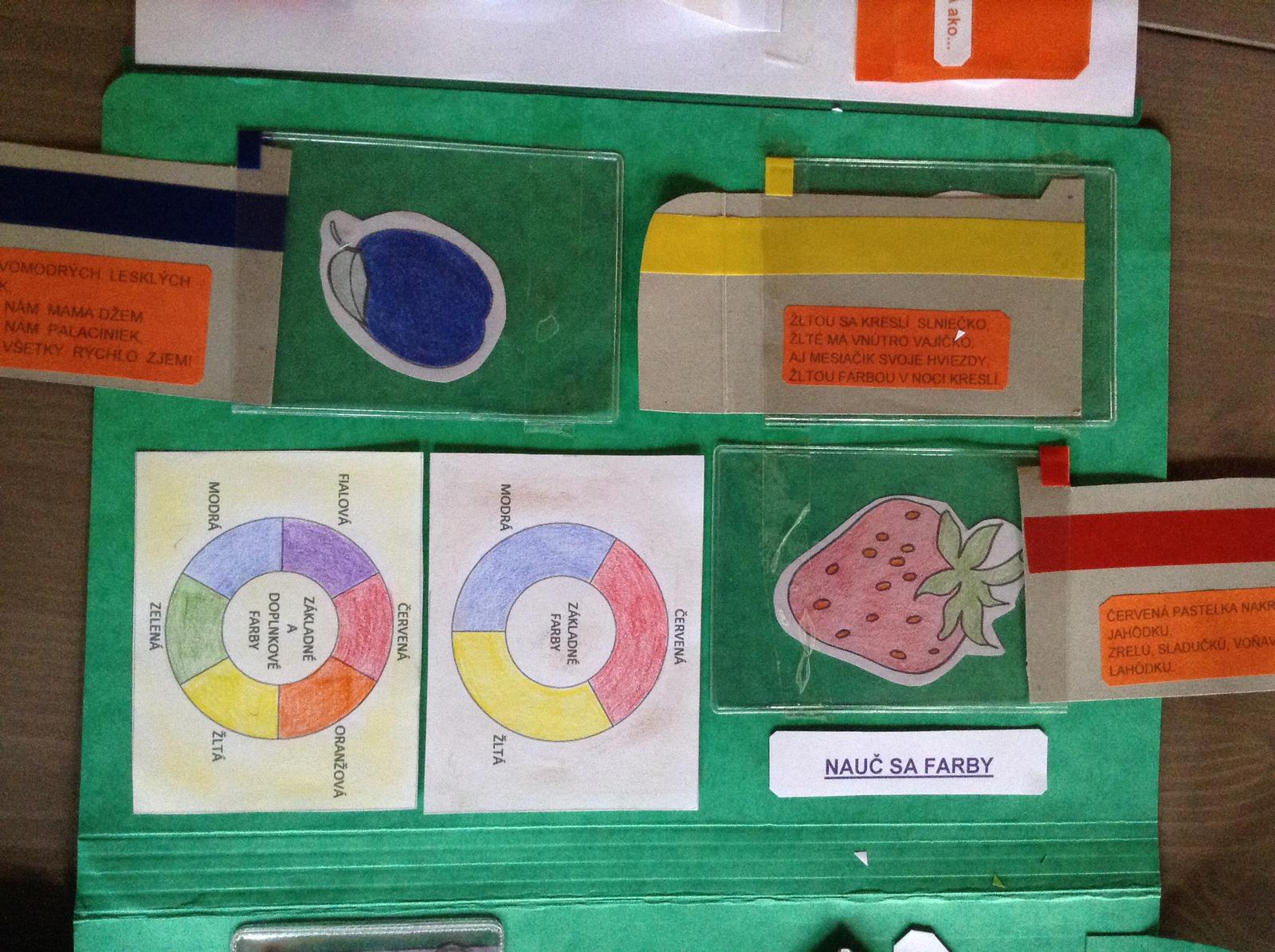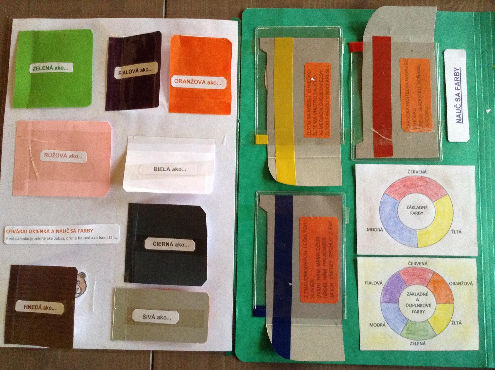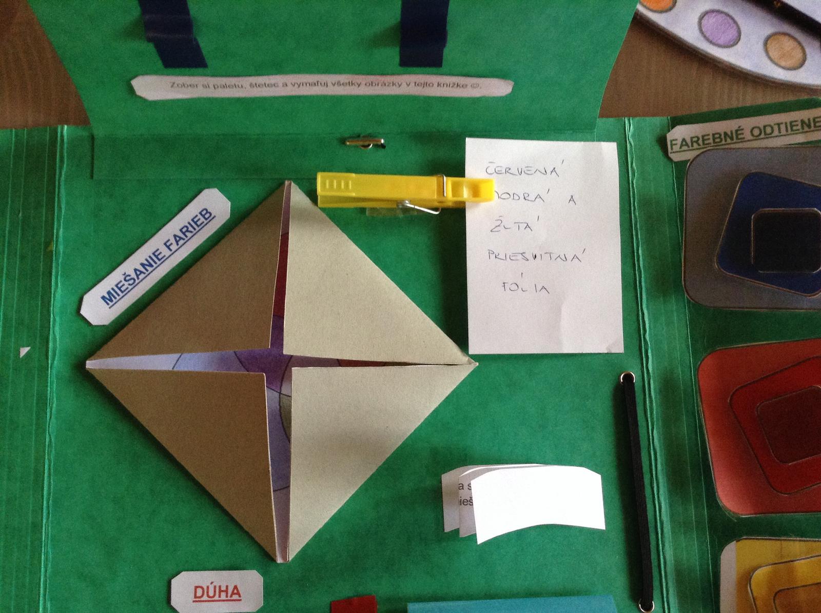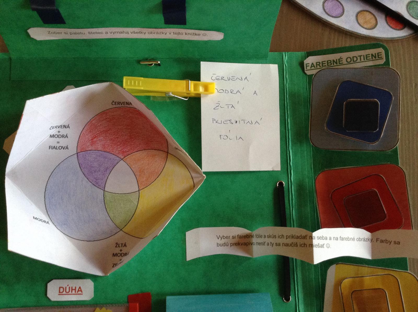 Miesanie farieb. V koliku na pradlo budu prichytene farebne priesvitne folie, ktore na seba mozete prikladat a miesat si tak farby. Takisto sa mozu prikladat na jednotlive obrazky v knizke a dieta uvidi ako sa farby menia/miesaju.