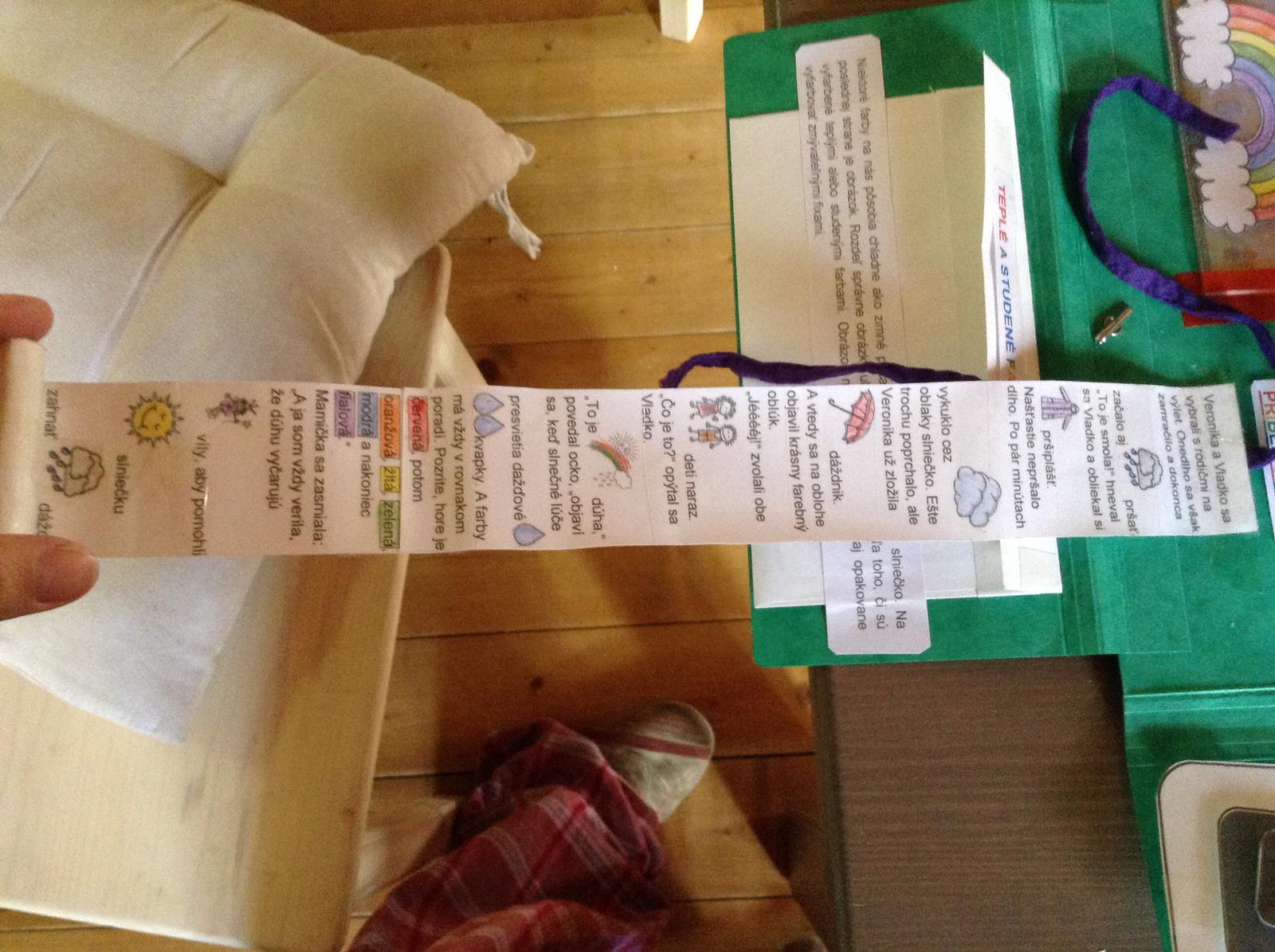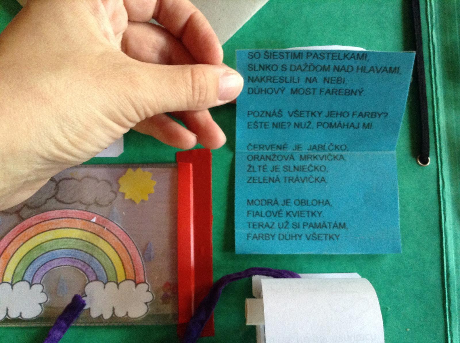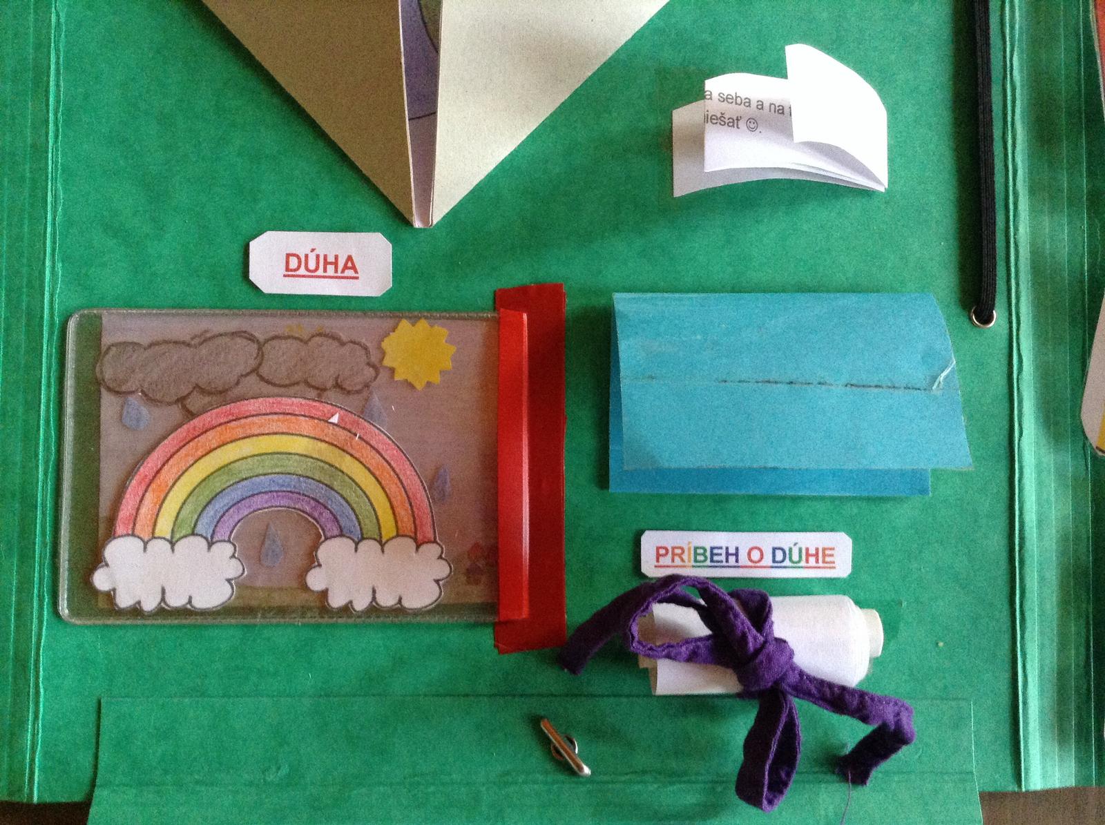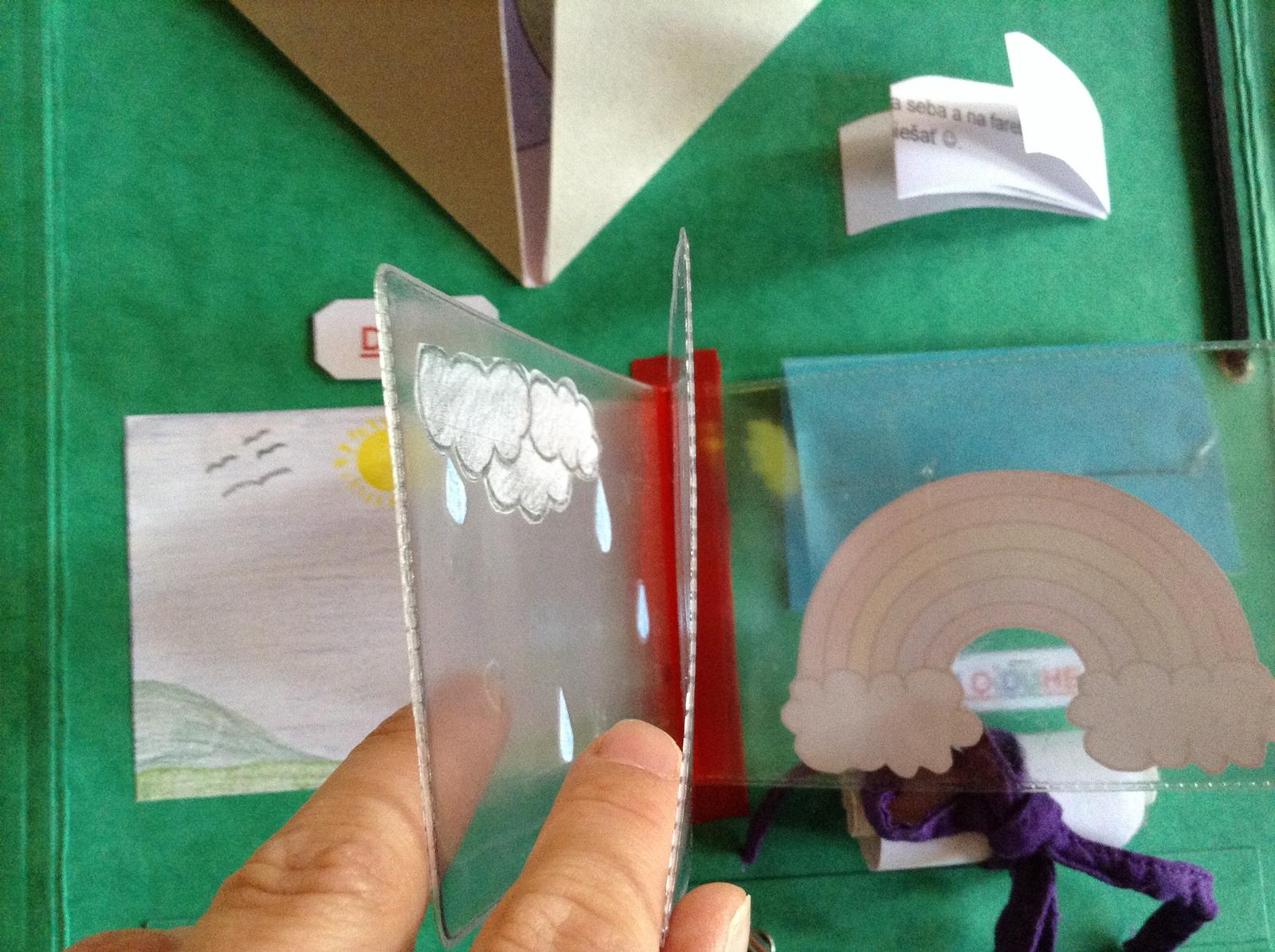 O duhe...je tam jednoduchy pribeh a basnicka. Plus sa za pomoci priesvitnych folii vrstvi obrazok - najprv je pekny den, potom sa zatiahne a prsi, este pocas dazda vykukne slniecko a objavi sa duha. Je to prilepene takou pevnou farebnou paskou a drzi to dobre. Pribeh je zrolovany a previazany stuzkou.