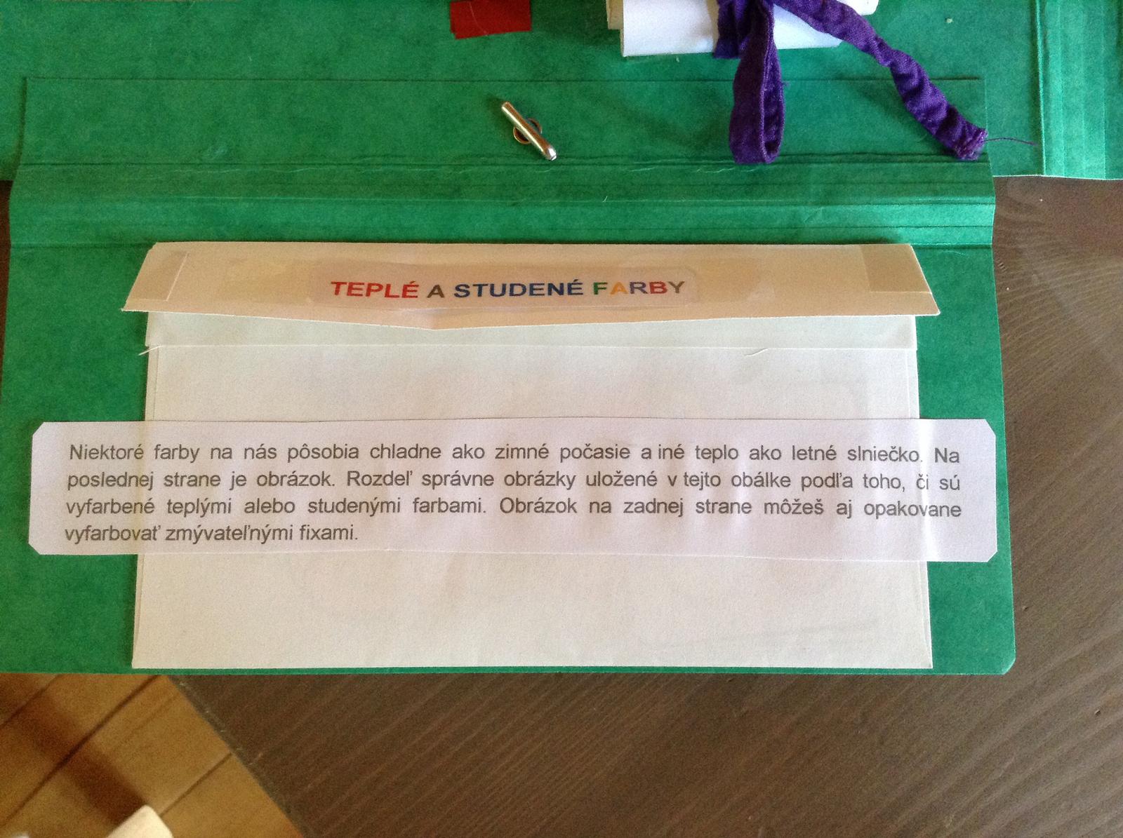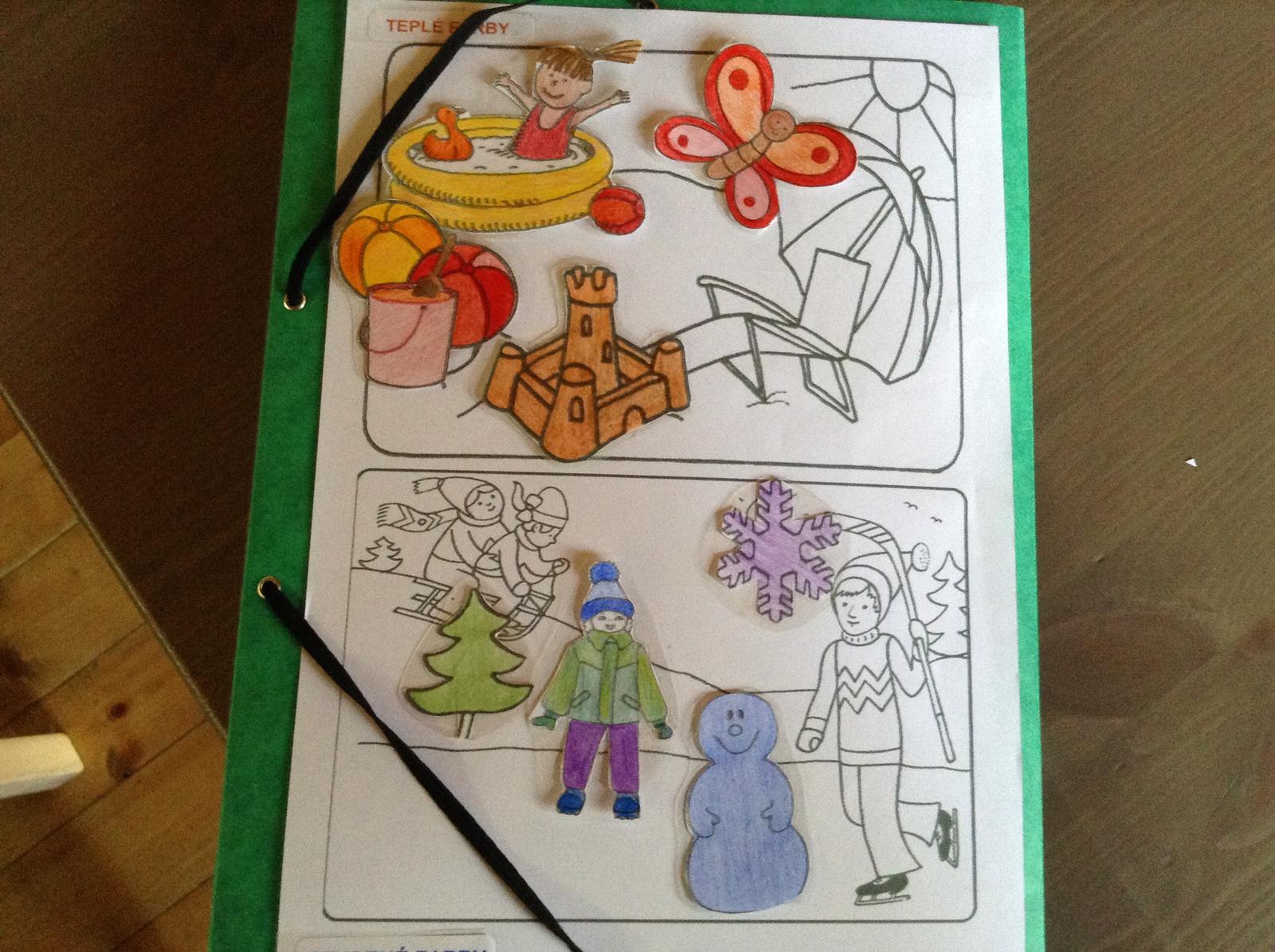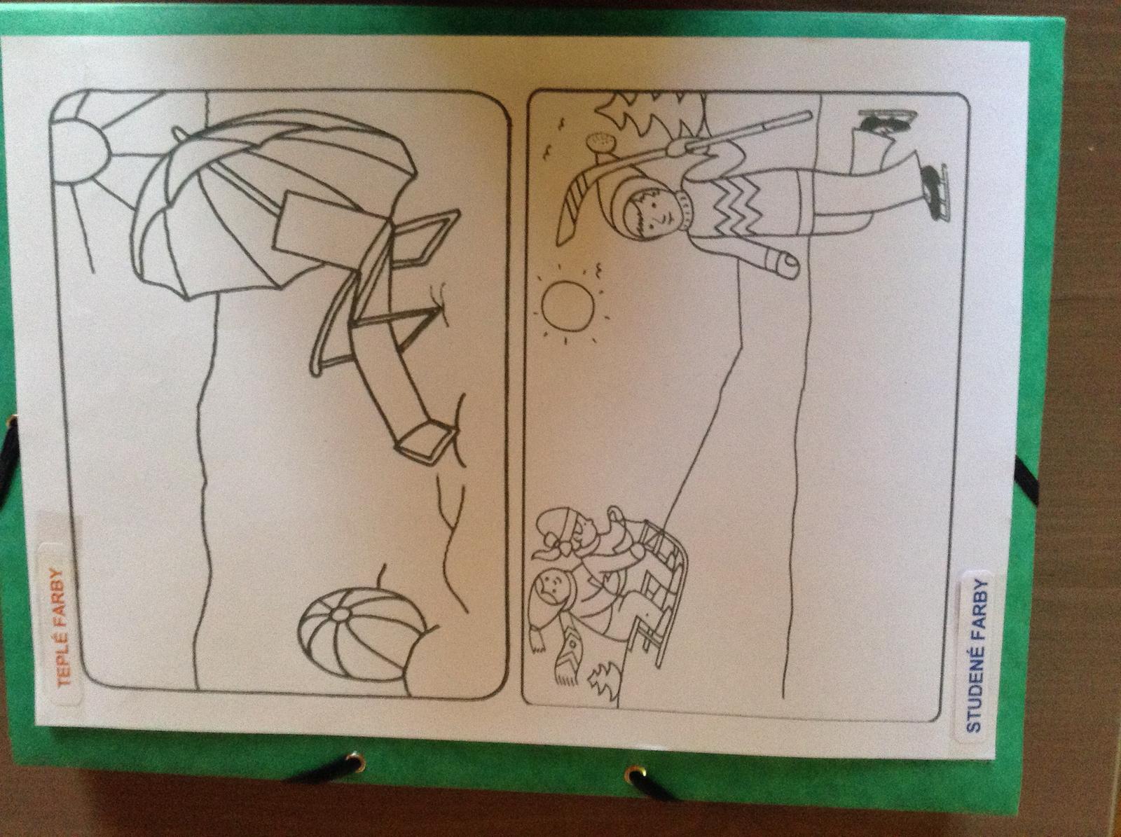 Teple a studene farby. V obalke su obrazky v teplych a studenych farbach, ktore sa prikladajuna obrazok na zadnej strane. Ten bude zalaminovany a bude sa dat aj opakovane vyfarbovat zmyvatelnymi fixami. Farebne obrazky na prikladanie mozem podlepit protismykovou podlozkou, len neviem ci to nebude moc hrube. A o tej obalke si co myslite...prezije? Sice som ju trochu spevnila, ale nie som si ista...