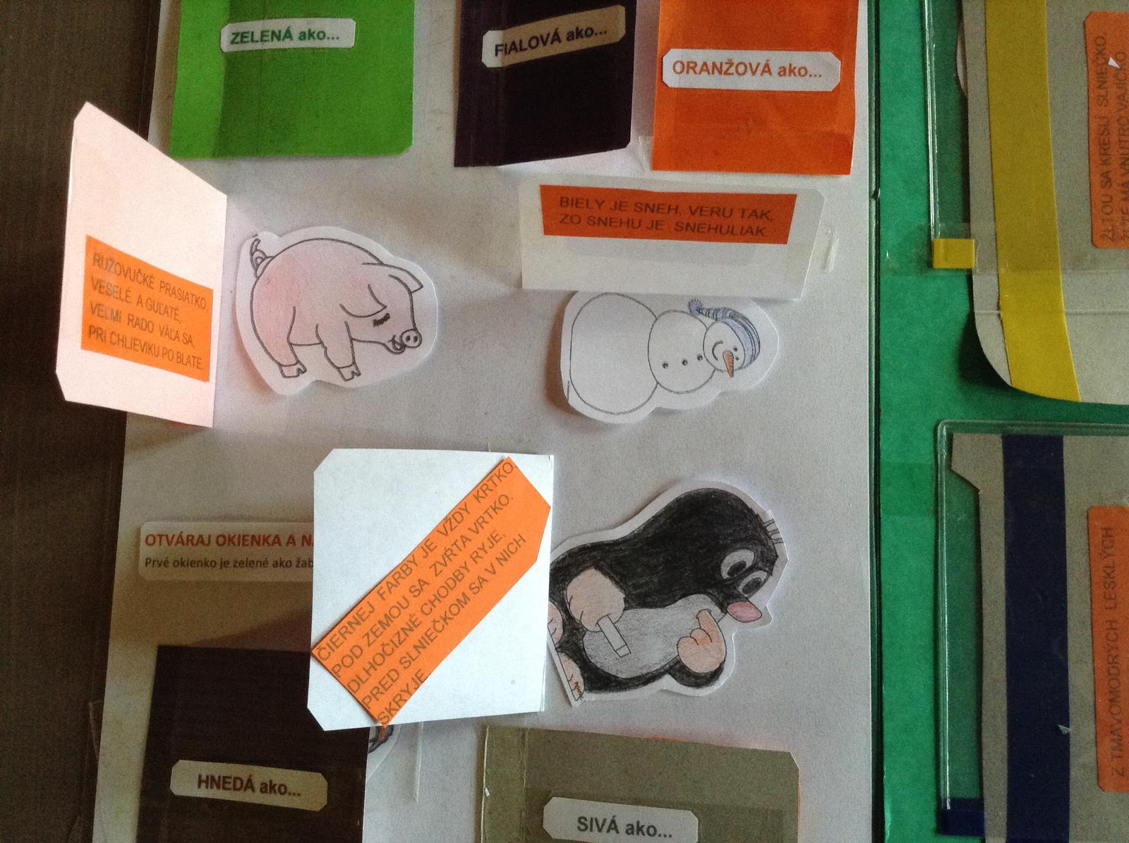 Zakladne a doplnkove farby. Tie okienka nie su velmi pekne urobene. Musim sa s tym viac pohrat. Tu su oblepene lep.paskou, ale je to skarede, tak asi odkukam ako to robite vy. Ci ich podlepit tvrdym papierom, alebo davat do priesvitnych folii... Na kazdom okienku je basnicka. Okienka so zakladnymi farbami su vysuvacie.