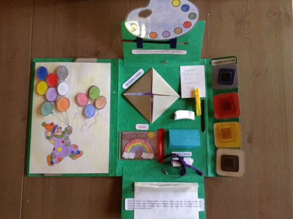 Miesanie farieb. V koliku na pradlo budu prichytene farebne priesvitne folie, ktore na seba mozete prikladat a miesat si tak farby. Takisto sa mozu prikladat na jednotlive obrazky v knizke a dieta uvidi ako sa farby menia/miesaju.