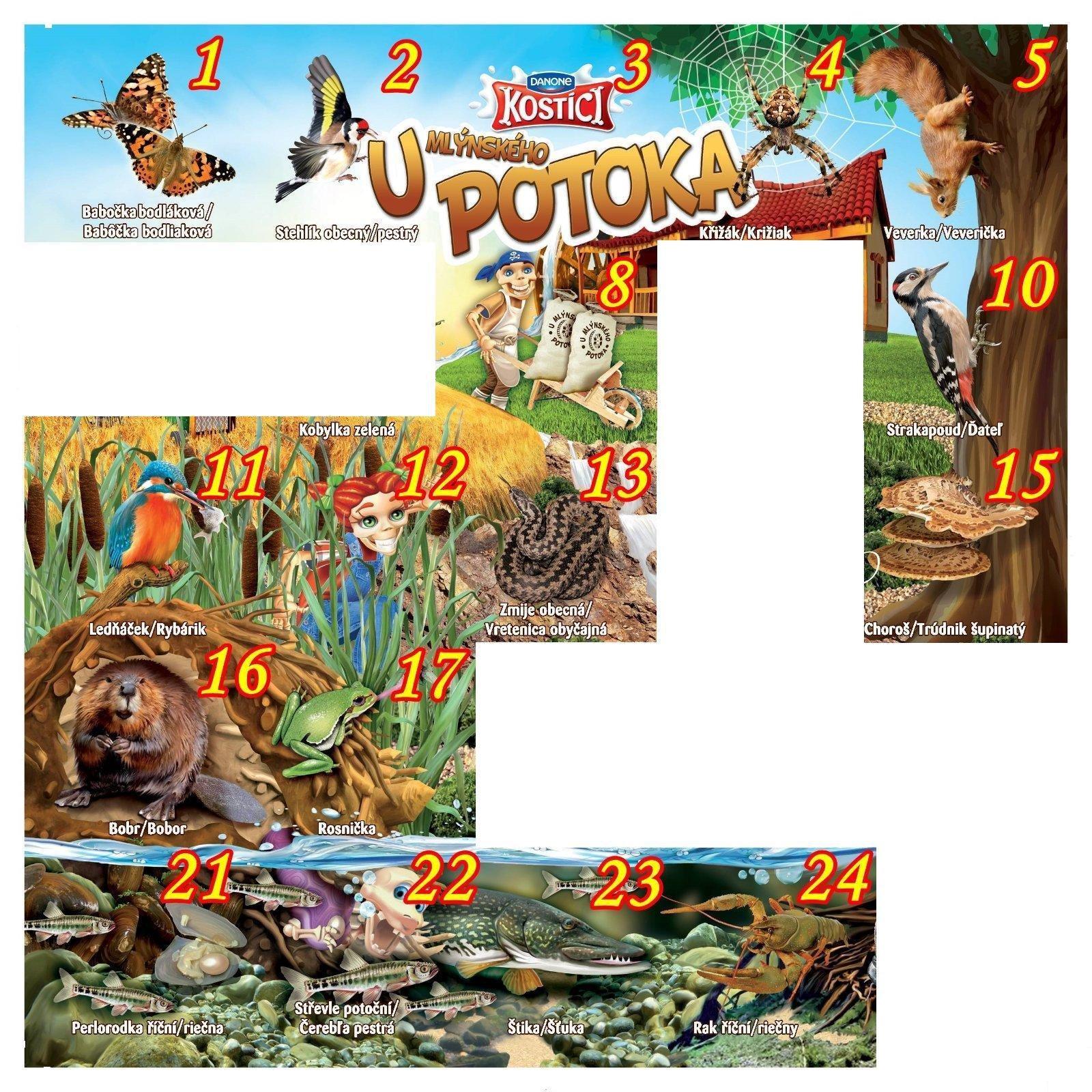 U mlynskeho potoka: 1-babocka, 2-stehlik, 3-pismena poto, 6-traktorista, 7-kobylka, 8-mlynar, 9-hus, 10-datel, 11-rybarik, 12-kosticka v trstine, 14-kosticka pri potoku, 15-choros huba stromova, 16-bobor, 18-salamandra, 19-pstruh, 20-vazka, 21-perlolodka, 22-cerebla, 25-sumec,