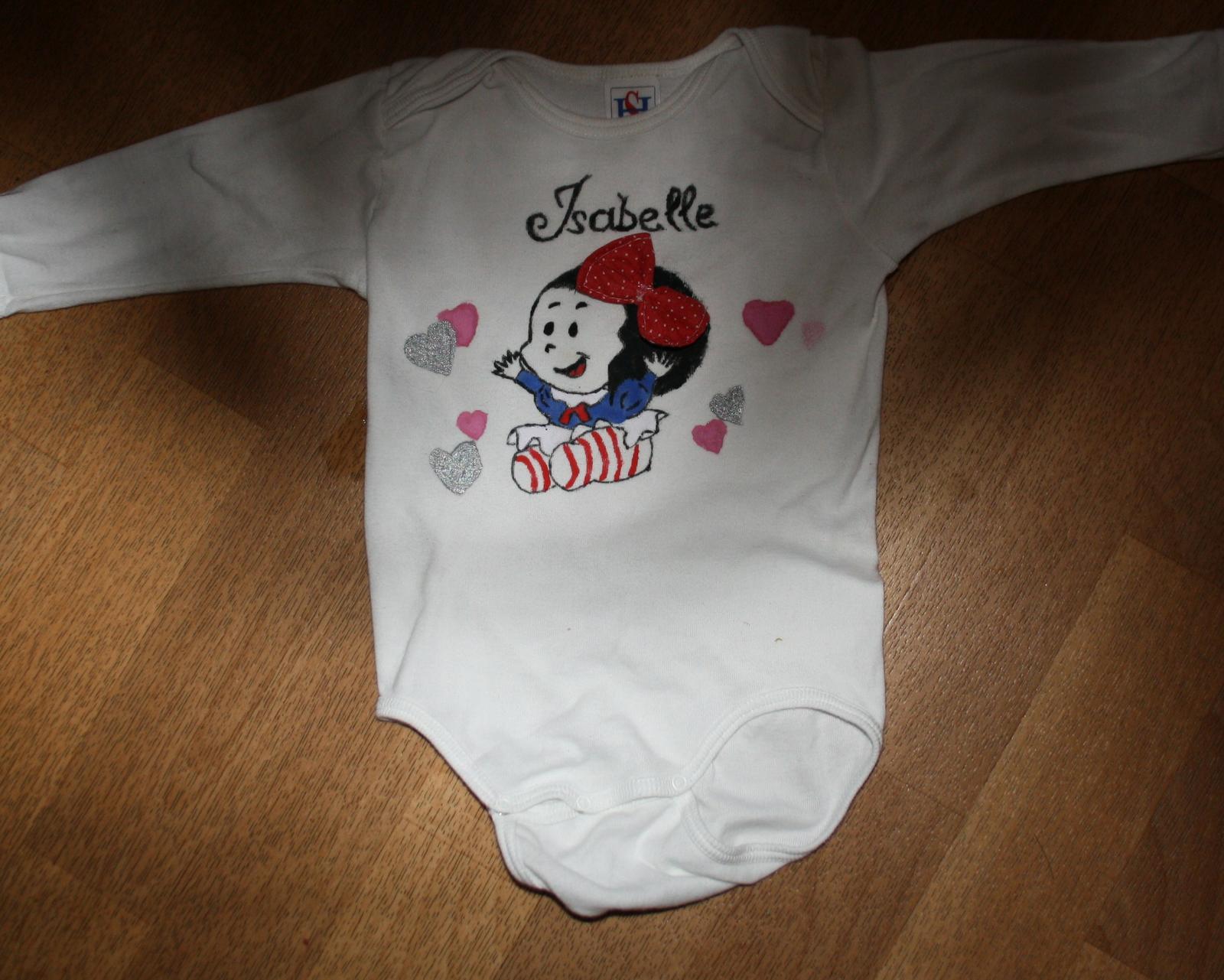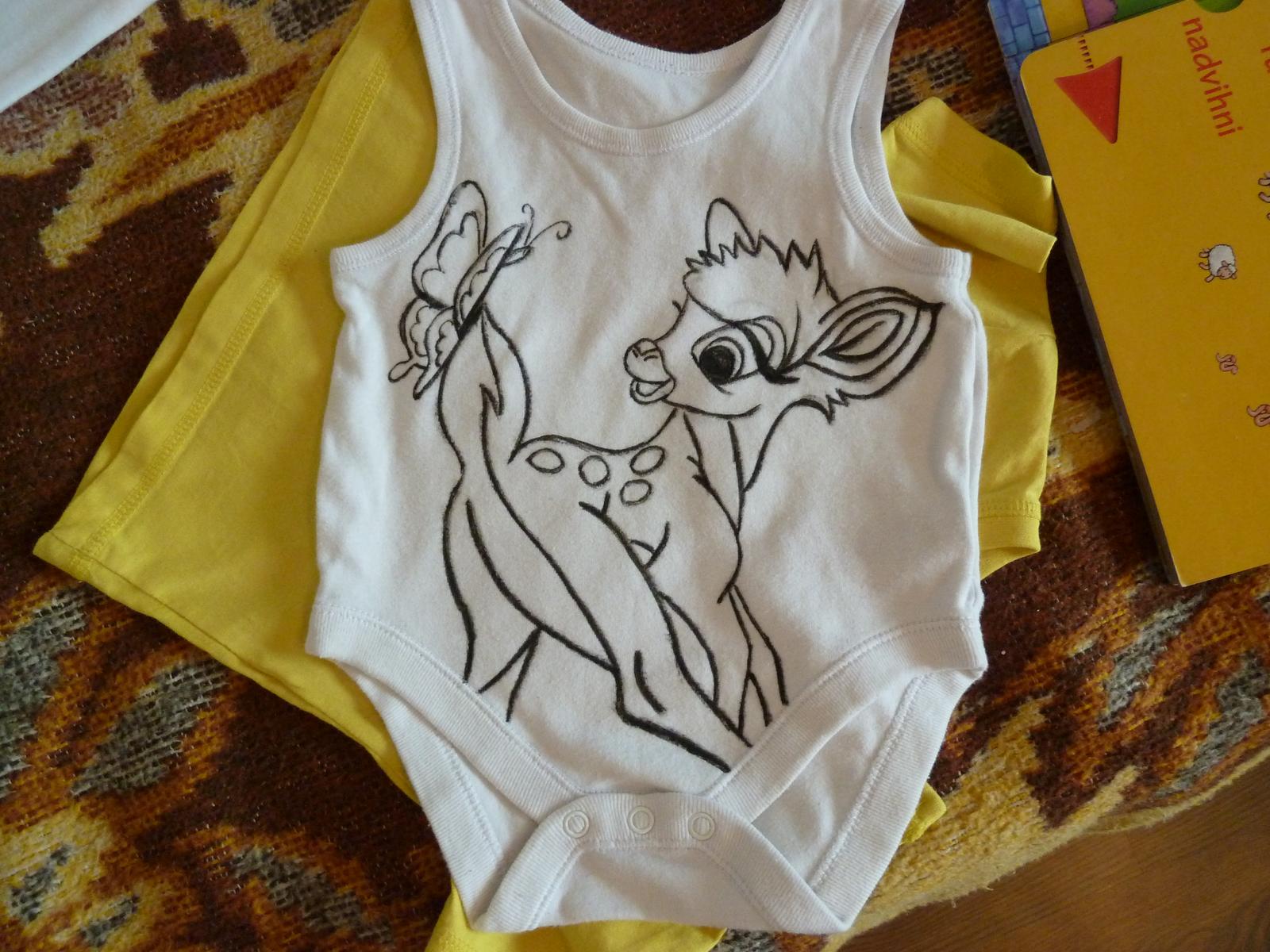 moja prva rybka🙂 potrebovala som vyskusat ako tie farby vlastne vyzeraju a tak som vzala stare bodynko- teda nenosene, len nam uz je velmi male, tak ze ho mozem teda pokazit... mam uz hotove dalsie 3obrazky, a tohoto bambiho idem robit teraz. nie je to take jednoduche ako som si myslela a hlavne davam dve vrstvy farby, nepaci sa mi ako to vyzera v jednej vrstve. mate nejake finty na to? a neuverite ze aka smola baby... mne sa vcera pokazila zehlicka ked to potrebujem zazehlit. to je asi velky problem ze? ked to zazehlim o dva- tri dni.. kym sa dostanem do obchodu kupit zehlicku...