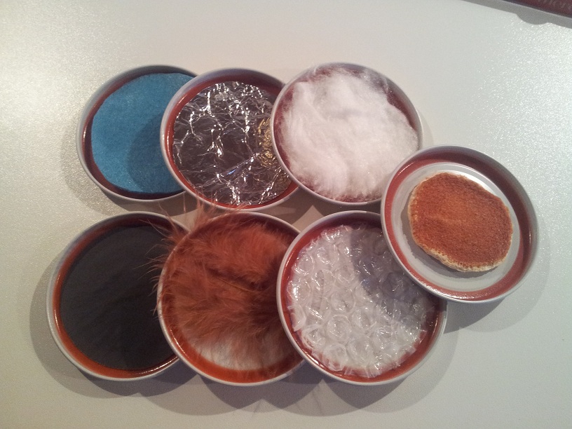 posielam vam prve ukazky mojej aktivity - hmatove vrecuska, zatial mam urobenu polovicu vrchnacikov (vid foto - smirglovaci papier, filc, vata, bublinkova folia, pomarancova kora, pierka, alobal) druha polovica je v stadiu rozrobenia - snazim sa vyberat hmatovo zaujivy povrch a material) mam tu akurat mensi problem s pomarancovou korou, lebo stale sa mi susenim zmensi ☹ tak dufam, ze vam nebude vadit, ak koliecka vnutri vrchnacika budu pri pomarancovej kore trosku mensie. Mam uz usite aj vrecuska, kedze ste vraveli, ze mozeme vyuzit materialy co mame doma, tak som pozhanala vsetky latky co som nasla a teda kazde vrecusko je inej farby aj vzoru (vid obrazok) ale kvalitou su si velmi podobne a snazila som vyberat pestre a pekne latky. Ak by sa vam nieco nepozdavalo alebo nepacilo dajte mi prosim spatne vediet, dakujem vam,