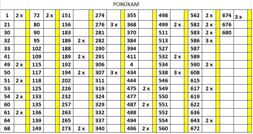 @evakopecka Ahoj. Z tých ktoré potrebujete máme: 62,138,328. Z tých, ktoré mi ponúkaš potrebujeme ešte 373, 455, 469, 531. Máš záujem?