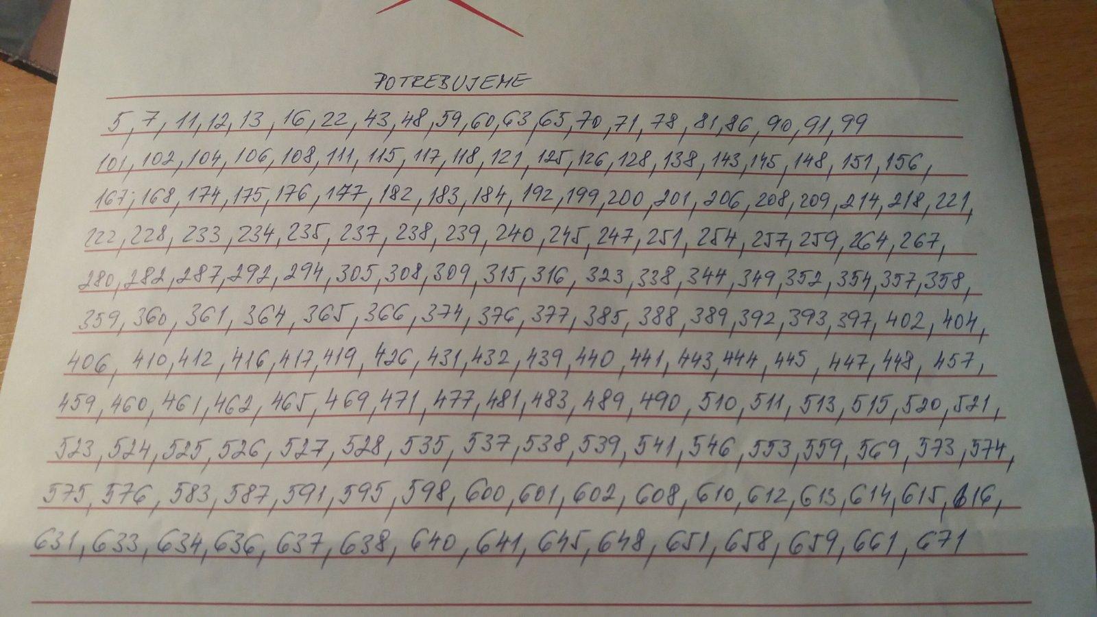 @lindushka01 Dobrý deň. Máme pre Vás tieto čísla: 206, 338, 359, 364, 366, 402, 559, 600 a 631. Od Vás by sme potrebovali: 1, 50, 69, 213, 242, 250, 302, 549 a 617. Súhlasili by ste? Ak áno, ozvite sa mi do IP a dohodneme sa.