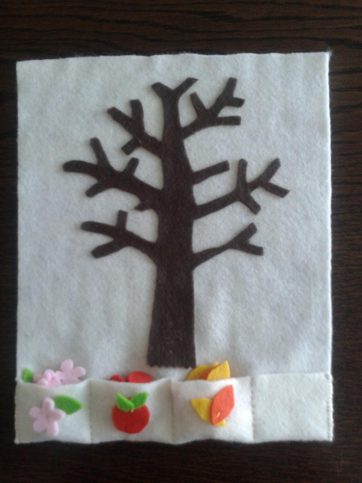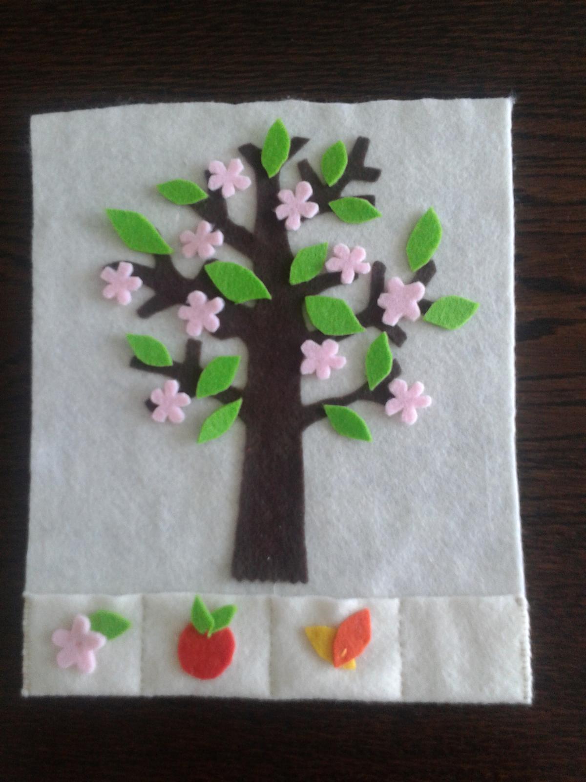Môj prvý polotovar 🙂. Rozmer cca A4. Podklad je krémový, aby vynikla biela farba pre sneh v zime. Tá tu bohužiaľ nie je, keďže mi poplietli objednávku a biely filc mi dodatočne ešte pošlú. Stačí si domyslieť biele guličky 🙂 . Strom je prilepený netoxickým lepidlom vhodným aj pre deti (zatiaľ drží😉). V spodnej časti sú 4 priečinky na odkladanie lístkov, kvietkov...